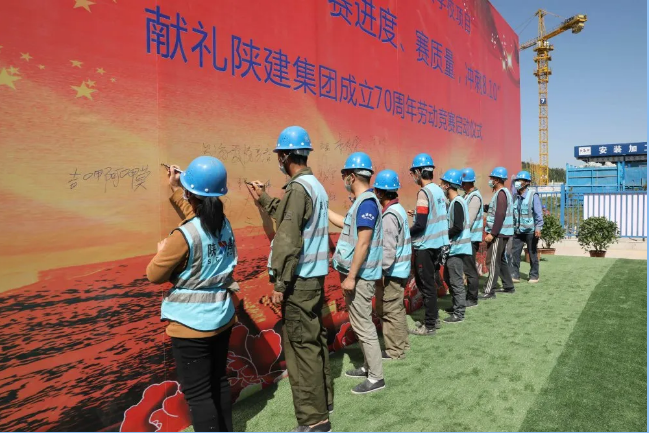 啟動(dòng)儀式上,公司生產(chǎn)管理部副部長路潔宣讀了《勞動(dòng)競賽實(shí)施方案》,明確此次勞動(dòng)競賽旨在加快施工進(jìn)度,提高生產(chǎn)效率,提高工程質(zhì)量、確保安全生產(chǎn),保證8月10日交付使用。施工單位、勞務(wù)公司代表分別作表態(tài)發(fā)言。他們表示將會(huì)以實(shí)際行動(dòng)推進(jìn)項(xiàng)目建設(shè),不辱使命、全力以赴,奮力完成各項(xiàng)任務(wù)目標(biāo),為陜建集團(tuán)成立70周年獻(xiàn)禮。隨后,全體人員在勞動(dòng)競賽背景墻簽字承諾。