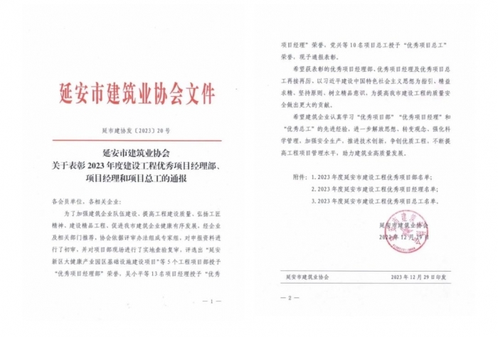 近日,延安市建筑業(yè)協(xié)會對2023年度建設工程優(yōu)秀項目經理部、項目經理、項目總工進行了表彰。
